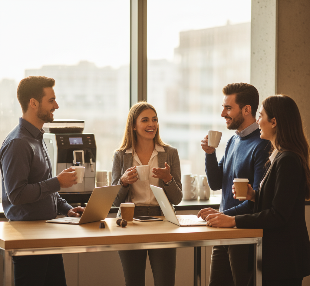 Un buen café mejora el ánimo de los empleados y refuerza la sensación de cuidado y bienestar en el entorno laboral. - Espacios que fomentan la comunicación